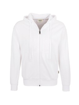 Sportive Kapuzen-Sweatjacke mit hochwertigem Reißverschluss von YKK®, gefütterter Kapuze mit Kordel und hochwertigen Metallösen von YKK®, formstabilen Rippstrickbündchen mit LYCRA®-Anteil, nicht angerauter Innenseite (French-Terry), Einschubtaschen und Nackenband. Hergestellt aus pflegeleichter Baumwolle-Polyester-Mischung für höchste Ansprüche. Gewebtes HAKRO-Necklabel aus hochwertigem Kettsatin mit weichen, ultraschallgeschnittenen Bandkanten für höchsten Tragekomfort und gewebtes HAKRO-Flaglabel an der linken Seitennaht.